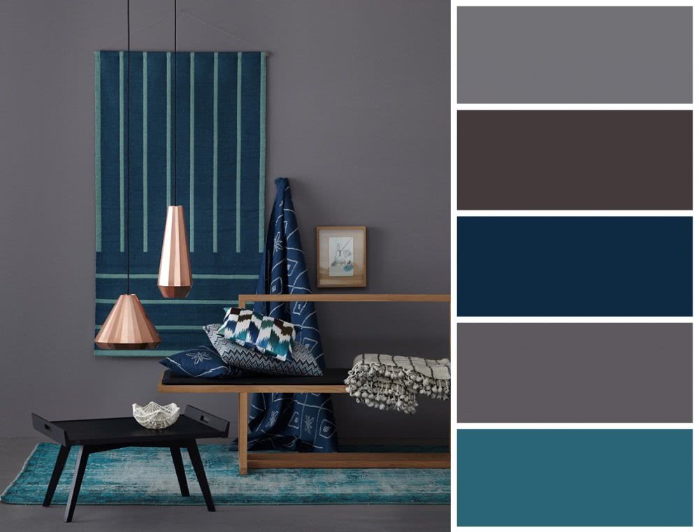 Серый + синий. Действует правило: берете темный синий – выбирайте светлый холодный серый, с ярким синим лучше сочетаются приглушенные оттенки.
