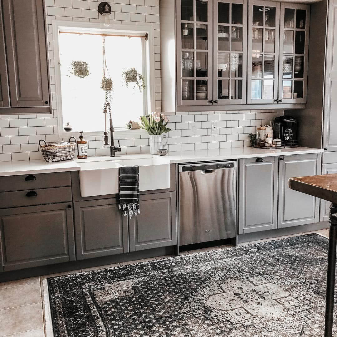 Серый пол в интерьере кухни.