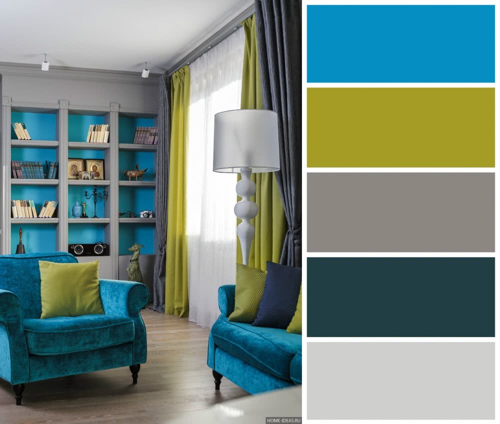 Серо-голубой цвет в интерьере гостиной.