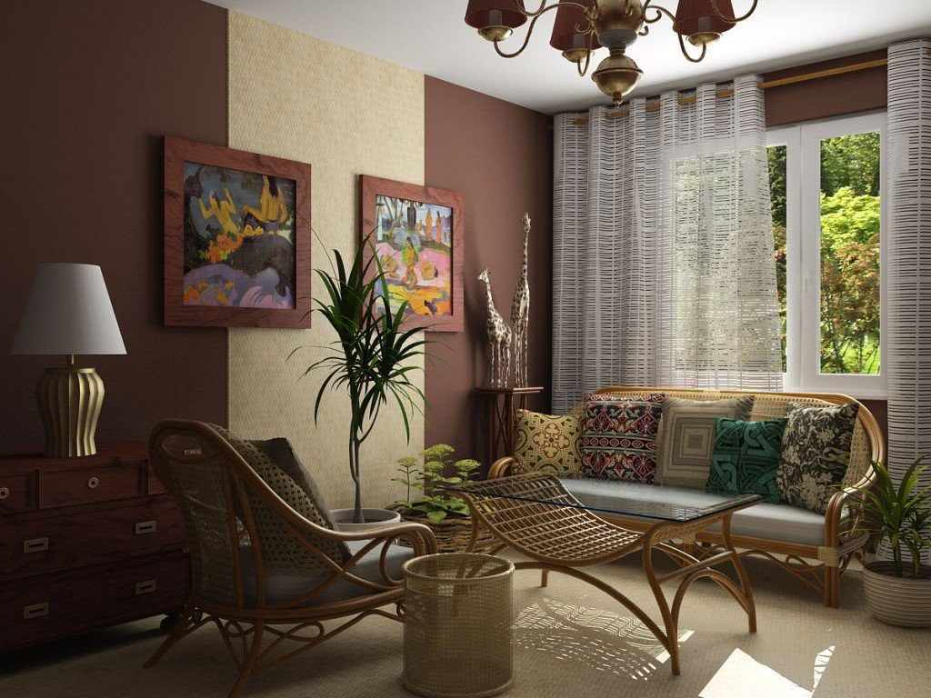 Обустройство гостиной коричневого цвета также будет отлично смотреться в эко-стиле. Мебель из ротанга и дерева, на фоне коричневых стен, будет выглядеть очень естественно. Бронзовый зал является естественной основой для декоративных элементов. Коричневый в эко хорошо смотрится в сочетании с зеленью. Зеленый цвет может преобладать на стенах, в то время как мебель и аксессуары могут быть в бежево-коричневых тонах или в противоположной комбинации.