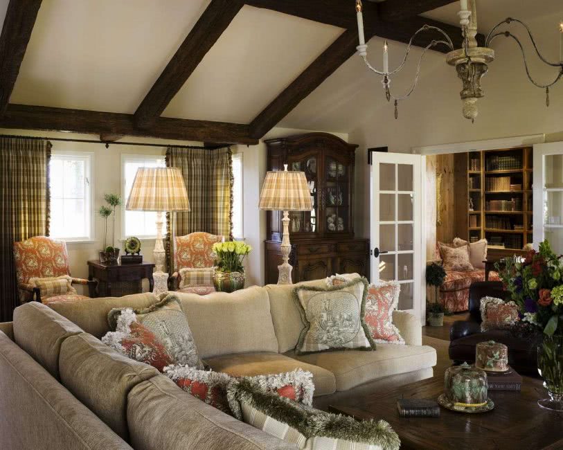 Кантри. Гостиные в подобном оформлении встречаются чаще в загородных домах и дачах. Для них свойственно использование натуральных материалов, таких как ткани или дерево. Осветительные приборы в стиле кантри также имеют в конструкции экологически-чистые элементы. Размеры и цвета люстр зависят от конкретного интерьера.