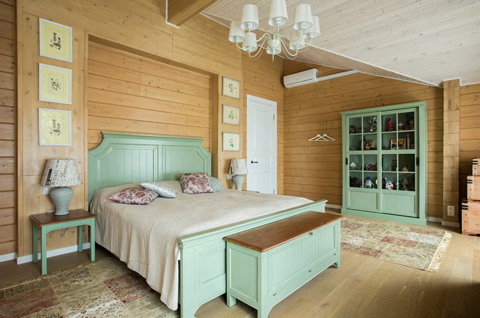 В кантри стиле сочетается со светлыми и темными оттенками коричневого, бежевого. Деревенский стиль украшают подушки, чехлы и пледы, текстиль и шторы в мятном оттенке.