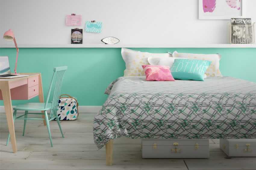 Также сочетание ментолового с белым поможет визуально расширить помещение. Белоснежный потолок, светло-мятные стены и тёмный пол – и ваша комната зрительно станет больше.