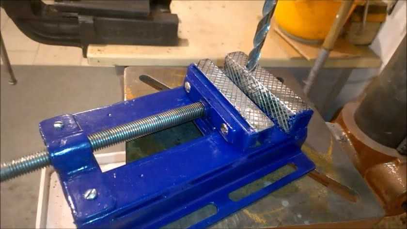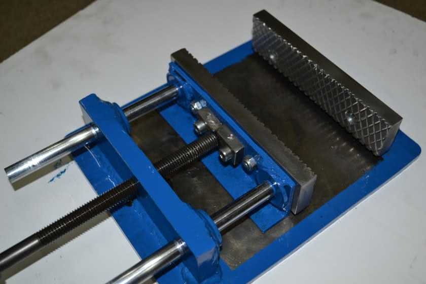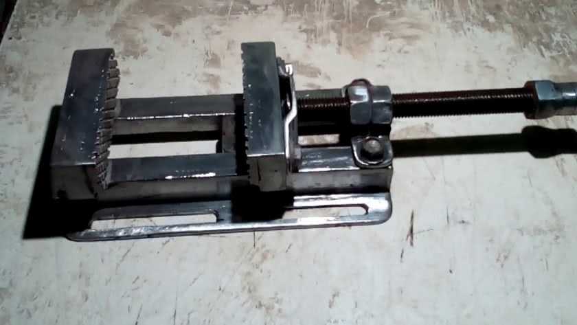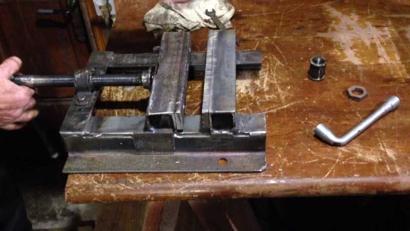На толстых листах стали необходимо просверлить отверстия, которые будут служить частью укрепления. Точно такие же отверстия нужно сделать на других заготовкам и сварить между собой уголок и изделие и толстой стали. Из штоков и еще одного уголка, нужно собрать подвижную часть тисков.