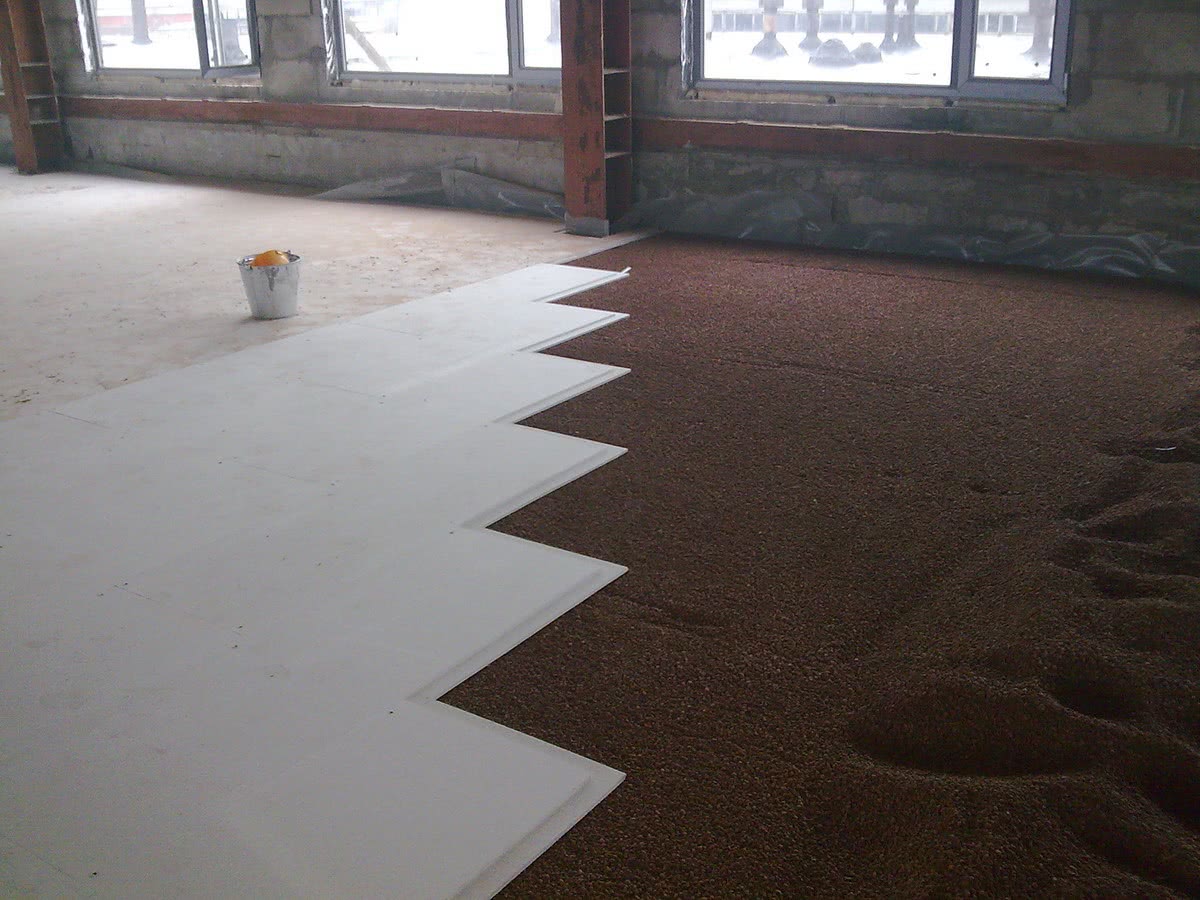 Толщина слоя керамзита должна быть не менее 30 см по грунту и не менее 20 см поверх плит перекрытия, только в этом случае будет обеспечена теплоизоляция пола. Керамзит следует насыпать небольшими порциями, тщательно выравнивая его правилом, во избежание образования пустот. Для надежности керамзит лучше всего тщательно утрамбовать. Сделать это можно достаточно простым способом: походить по слою керамзита, утрамбовывая его ногами. Когда подушка из керамзита готова, можно приступать к заливке.