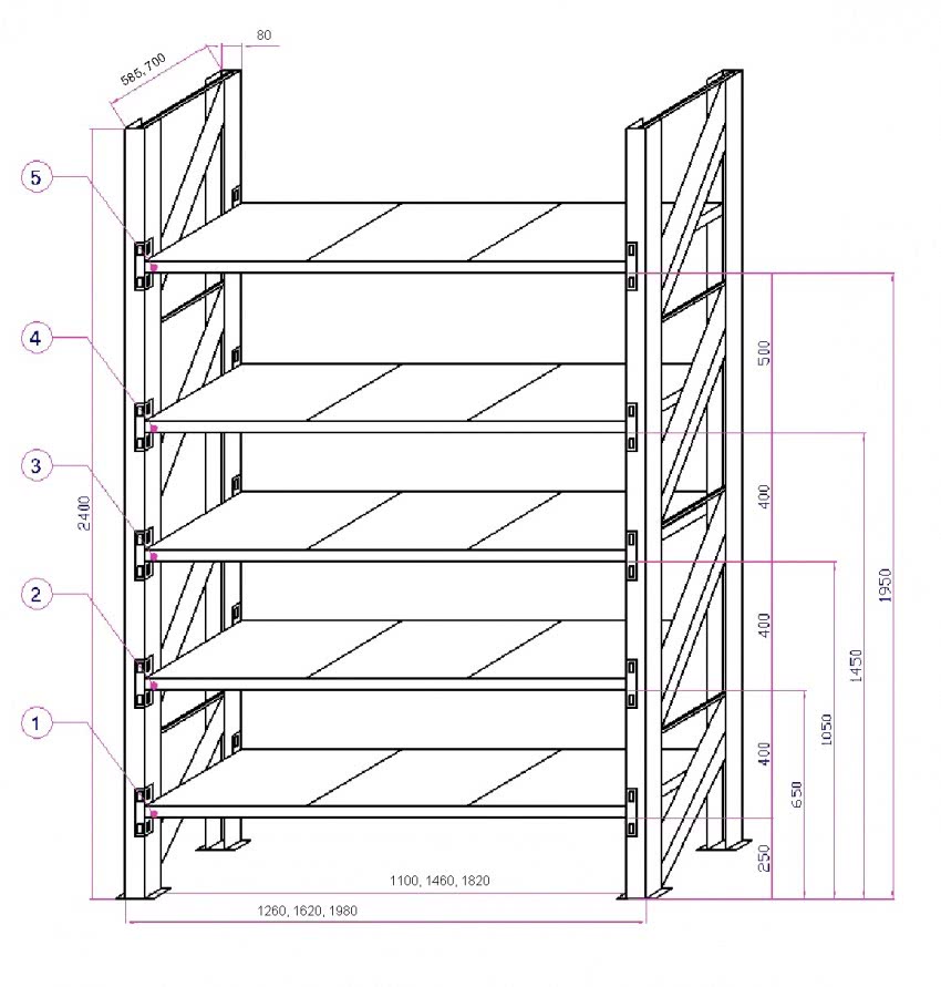 Если на стеллаже будет размещены книги или домашняя консервация, то его стойки не следует раздвигать слишком широко. 50-60 см – оптимальный шаг деревянных рам такой конструкции. Для металлического уголка 50х50 мм это расстояние можно увеличить до 80-100 см (схема №1).