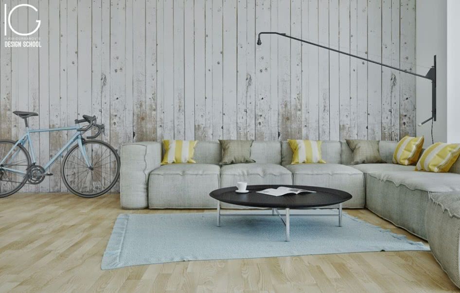 Обеспечить стиль помогут необработанные кирпичные или бетонные стены. Их можно сочетать между собой, добавляя отштукатуренные поверхности, которые покрашены белой или серой краской. Если не хочется снимать слой штукатурки, достаточно использовать декоративную кирпичную кладку или деревянную доску. Для пола подойдут следующие варианты: