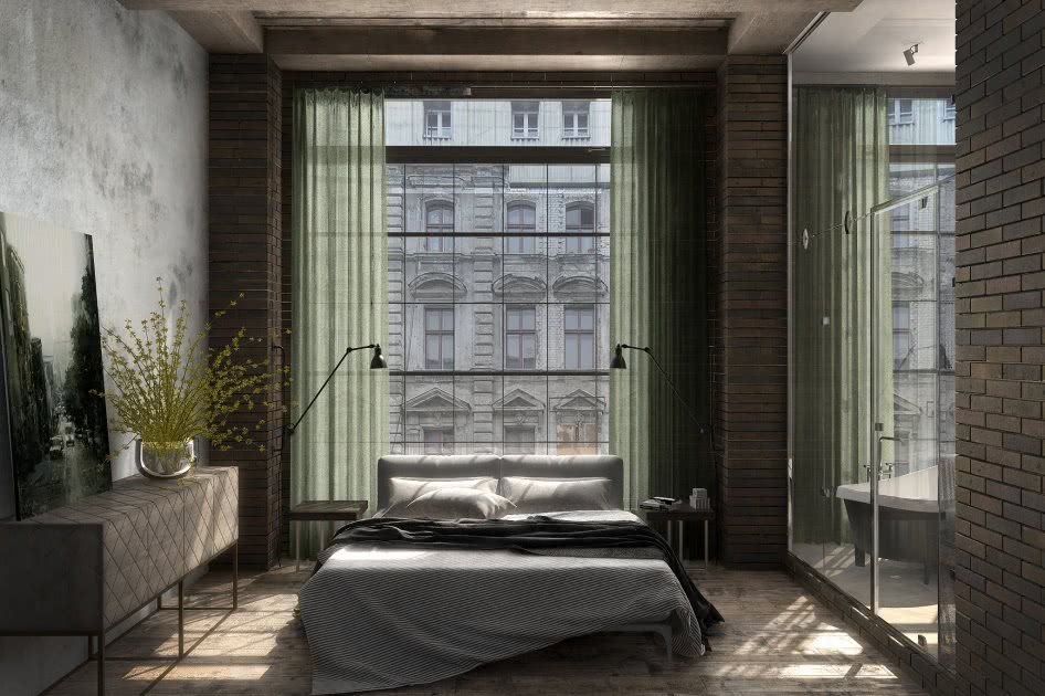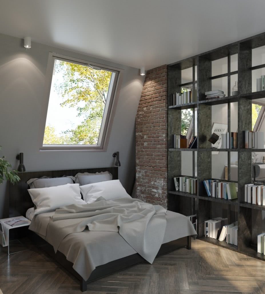 Интерьер в стиле лофт самого уединенного местечка в квартире- спальни, требует особого подхода:
