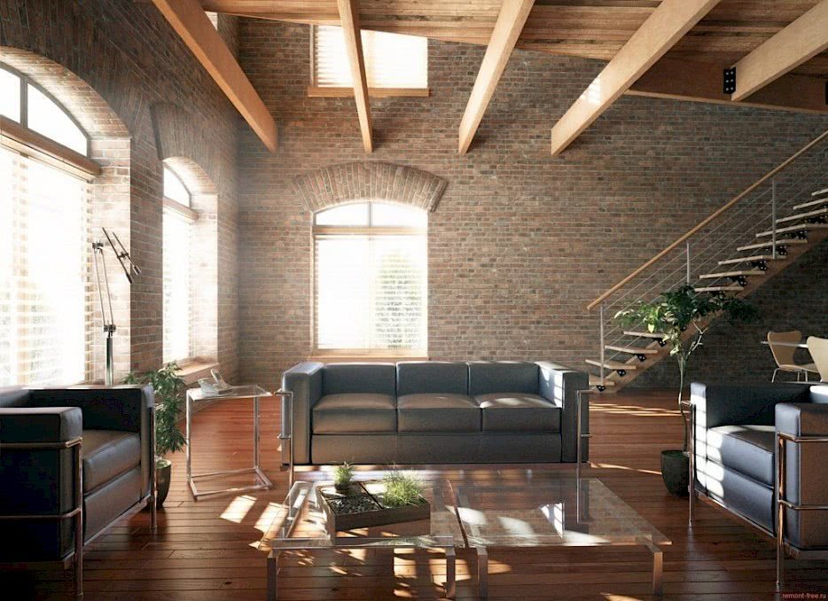 - В облицовке присутствуют более грубые и необработанные материалы, в виде бетона, кирпича или неровно нанесенной штукатурки, подчеркивающей первозданный вид чердачного помещения.