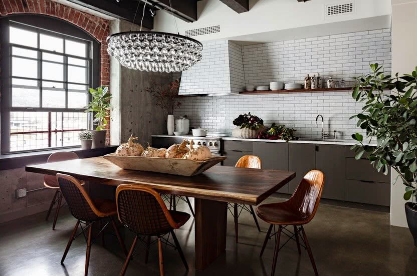 Концепция лофтового направления в дизайне помещений базируется на органичном сочетании противоположных стилей. Неплохо смотрится строгий кожаный диван по соседству с изящными стульями с красивой обивкой, окружающими старинный роскошный стол.