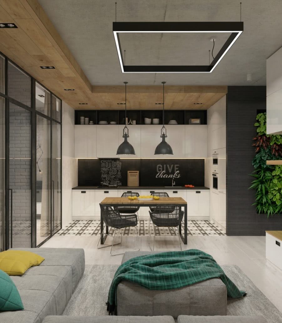 В качестве напольного покрытия для кухни в стиле лофт идеально подойдёт метлахская плитка, которая отличается повышенной износостойкостью.