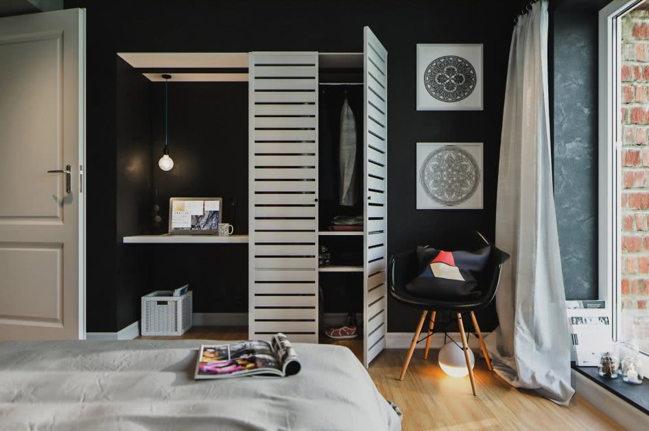 - Для того чтобы избежать захламления, купите шкаф-купе или используйте потайные ниши для верхней одежды.