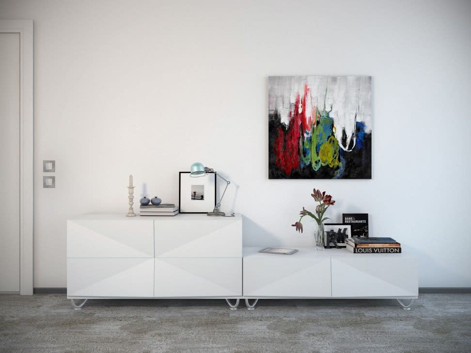 Картина, стоящая на полу, акцентирует на себе внимание. Это подчеркнёт необычность и современность кухни