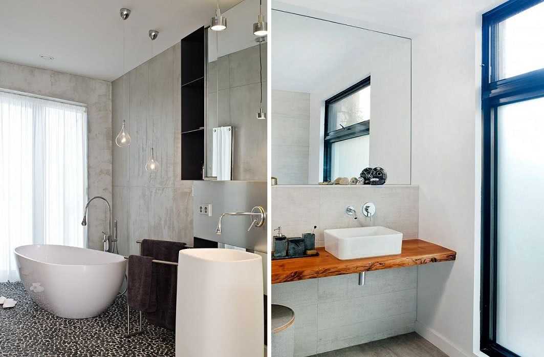 Любой стиль многогранен, и лофт — не исключение. Особенно остро это ощущается почему-то именно в ванной: слишком разные подходы к выполнению одной и той же задачи. Например, на фото ниже — это только формальное выполнение требований стиля: простые ровные формы сантехники, такие же простые плафоны, сдержанная цветовая гамма. Только легкий налет стиля, которые, тем не менее, четко угадывается.