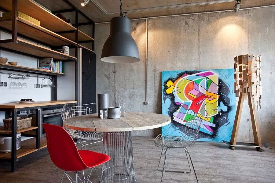 Все признаки стиля налицо: простые формы мебели, открытые коммуникации, подвесные светильники и стол на мощных металлических ножках. Даже холодильник имеет необычный вид — дверки ровные, окрашены под «старый металл».