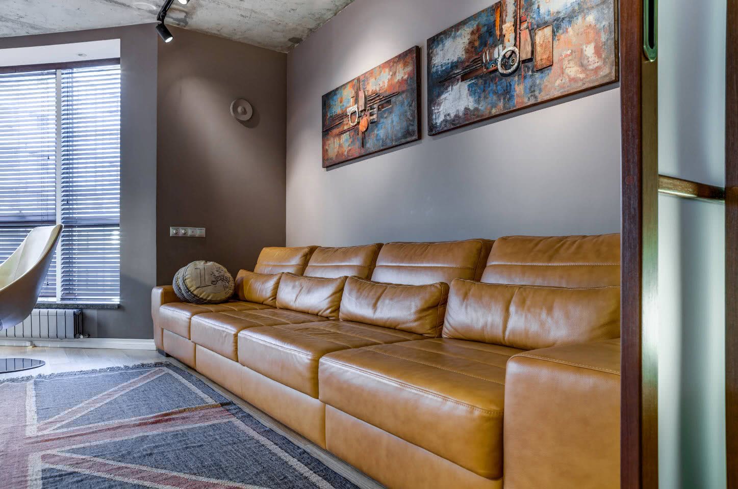 В гостиных, как правило, присутствует диванная группа — мягкая мебель, сконцентрированная на определенном пространстве. Только стиль лофт предполагает ее расположение по центру комнаты, чтобы до стен было достаточно места: можно было свободно пройти.