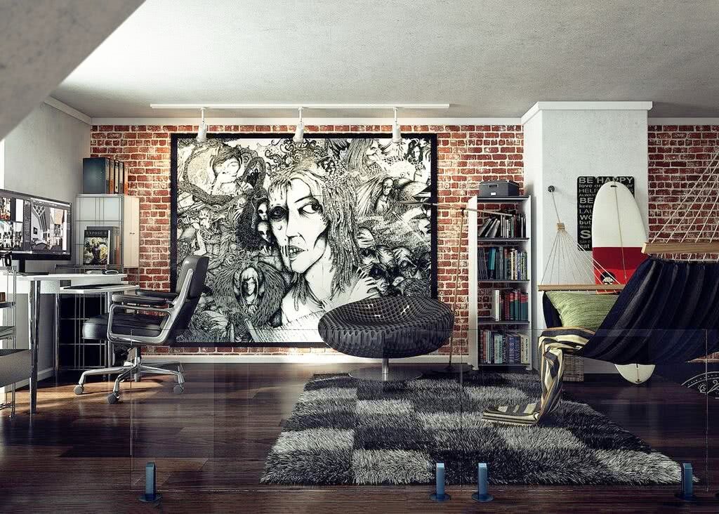 Концепция лофтовых апартаментов позволяет для оформления интерьера использовать плакаты и постеры с оригинальными надписями и специфической графикой. Черные и белые цвета декораций органично сочетаются с типографским текстом.