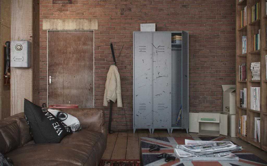 2. Индустриальный. Максимально грубая отделка дополняется практичной функциональной мебелью чётких геометрических форм. Общая идея – как можно сильнее приблизить вид комнаты к фабричному помещению.