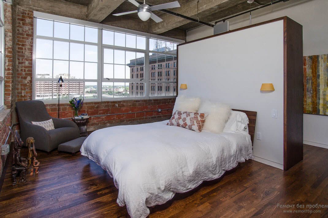 Спальня – это более интимное помещение в доме, поэтому отелить его от остального пространства следует непрозрачной перегородкой. Это может быть матовое стекло, шторы, ширма или даже обычная стена. При отделке стен лучше всего одну из них оставить кирпичной или бетонной, а остальные окрасить в однотонные спокойные цвета, что позволит смягчить пространство и сделать комнату более уютной.