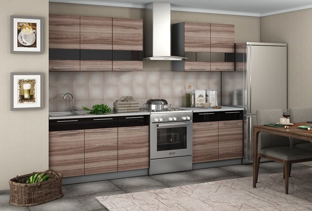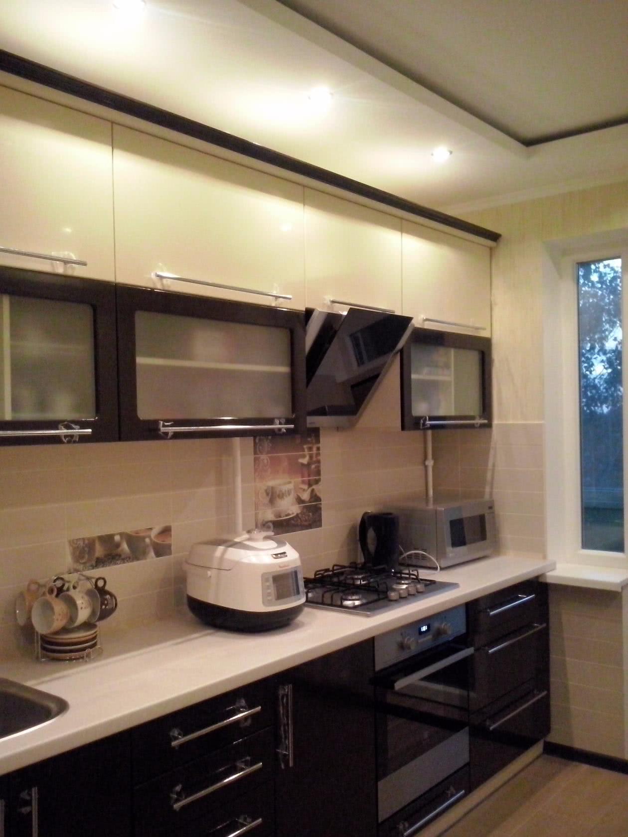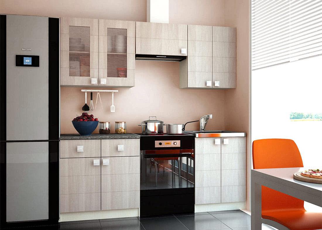 Это вариант наиболее простой, так как требует для своей реализации обычный вид кухонного гарнитура, располагающийся по одной стороне, чаще всего такой тип использовался в недалекие советские времена, так как он больше подходит для кухонь маленького размера. Но и по сегодняшний день этот вид является весьма популярным, с одно стороны такой проект стоит чаще дешевле остальных, с другой жилье эконом класса всегда было есть и будет.