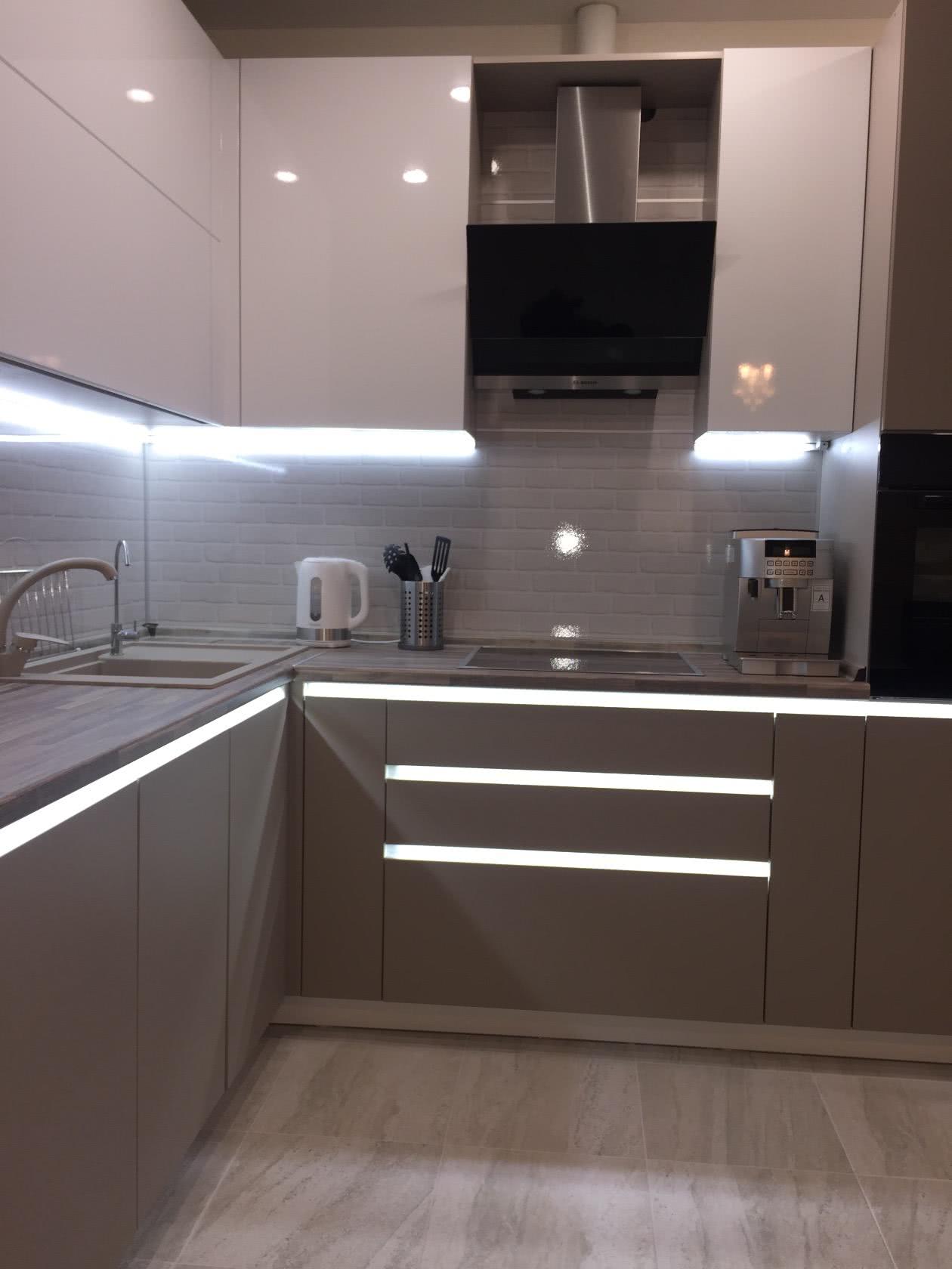 Что касается освещения, то тут тоже есть несколько важных моментов. Нужно, чтобы верхний свет был направлен на рабочую зону, а не вам на голову. Подсветка светодиодными или точечными светильниками по всей длине столешницы объединит композицию и создаст уютную, романтическую атмосферу. Где расположить светильники? Лучший вариант – встроить их в навесные шкафчики.