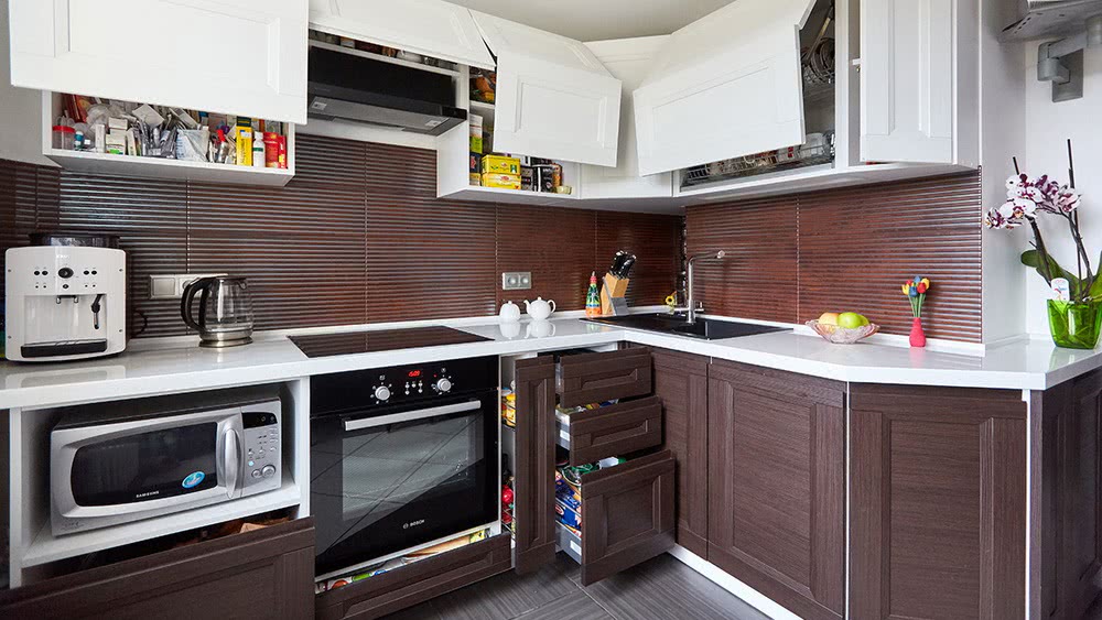 Угловой гарнитур для небольшой кухни лучше выбирать средних или вовсе маленьких размеров, с возможностью встраивать бытовую технику. Также стоит отказаться от большого количества навесных шкафчиков – 2-3 неглубоких, но вытянутых вполне достаточно. Хорошо если у них будут складные или откидные дверки – они экономят пространство, а пользоваться ими очень удобно.