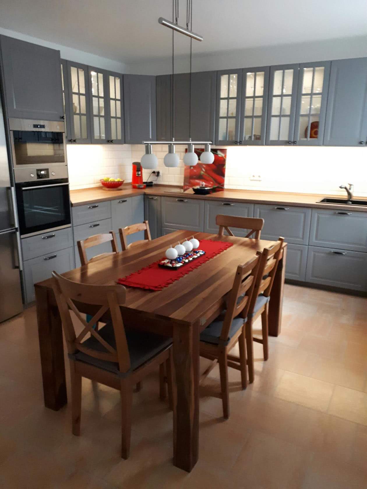- Откажитесь от части дорогостоящих навесных шкафов, разбавив их полками и удобными и вместительными столами.