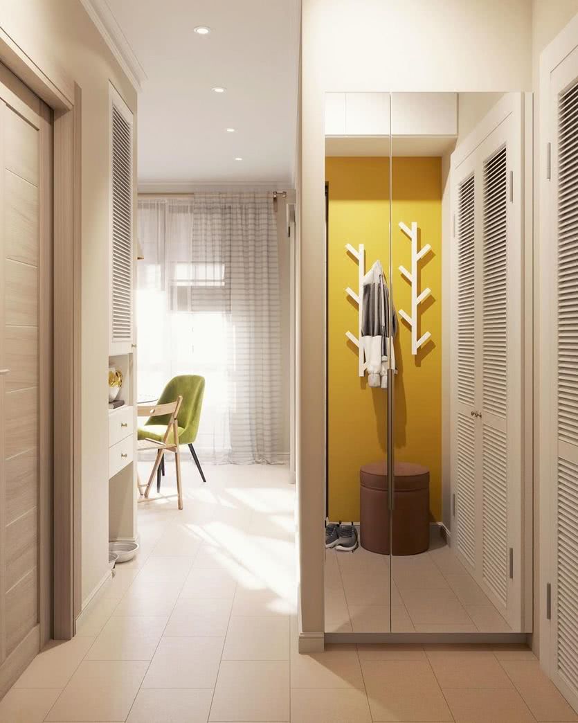 - Мы также можем использовать свет для оптического увеличения прихожей. Было бы хорошо, если бы дверь, ведущая в соседние комнаты, была застеклена.