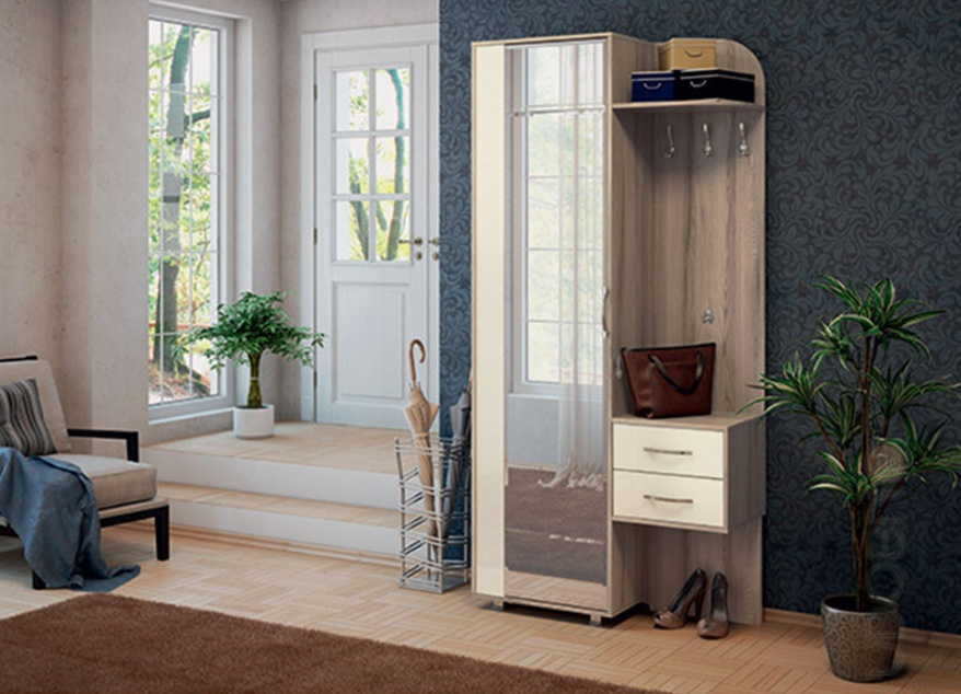 Это бюджетный вариант — малогабаритные прихожие в коридор стоят порой не восьми тысяч (но есть и значительно дороже, все зависит от размера и состава мебели в комплекте). Фабрики выпускают некоторое количество готовых комплектов/наборов корпусной мебели для малогабаритных прихожих. В них обычно входит тумба с зеркалом, вешалка, может быть добавлен шкаф с распашными или раздвижными дверками. В собранном виде они есть на витринах мебельных магазинов, вам привезут точно такой же, но в виде дощечек. Можно также оплатить сборку или собрать самостоятельно.