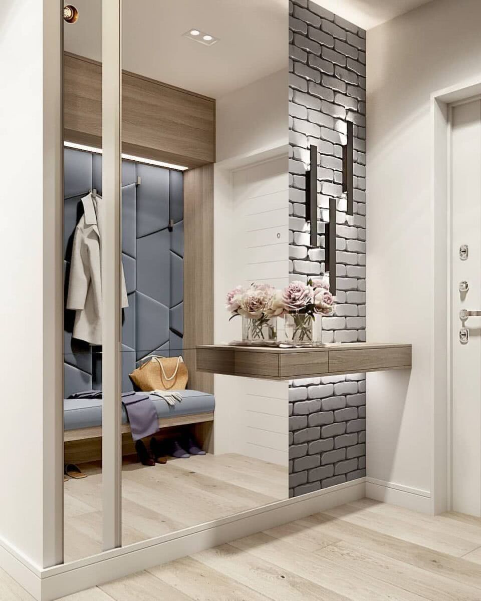 Если при расстановке визуально уменьшается ширина, воспользуйтесь панорамными зеркалами от пола до потолка: они визуально увеличат пространство вдвое, возле входа оставьте место для узкой скамейки-обувницы.