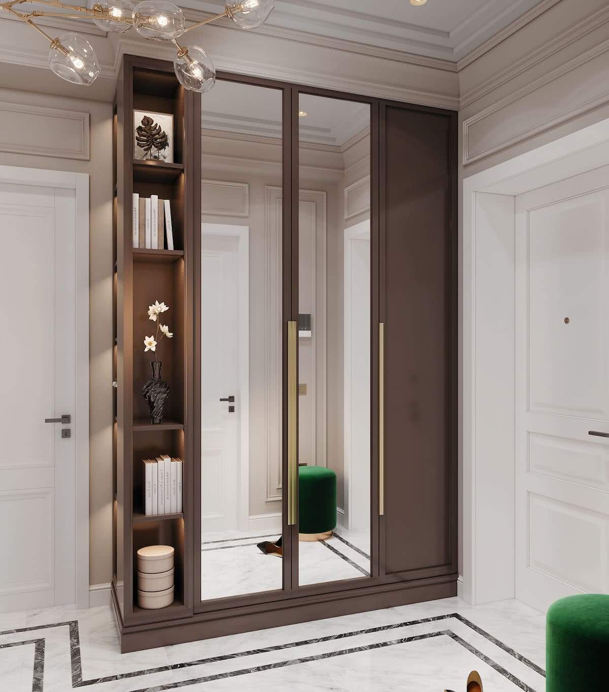 Для прихожей средних размеров подойдёт шкаф с раздвижными дверями, в среднюю секцию которого вмонтировано большое зеркало во всю высоту. В большой прихожей отлично встанут модули с распашными дверцами. При необычной планировке нужно искать угловые модули, позволяющие продуктивно использовать пустующие углы.