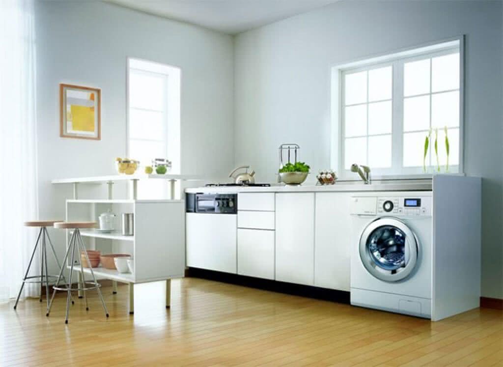 Существует большое количество способов установки встроенной стиральной машинки на кухне. Большинство из них направлены на то, чтобы спрятать технику с видного места и не нарушать целостность стиля.