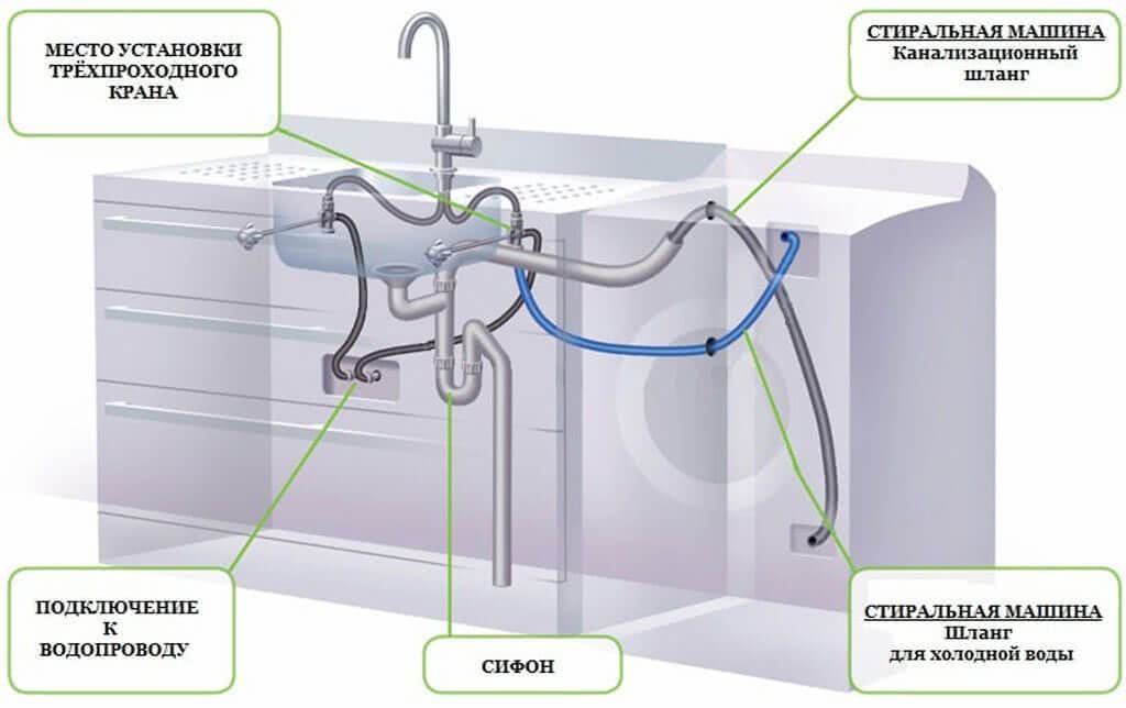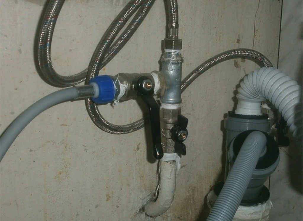 Для забора воды нужно подключить технику к системе водоснабжения. Приобрести шаровой кран, шланг идет в комплекте. Можно заранее при замене или прокладке труб поставить для стиралки специальный смеситель с отводом. При помощи тройника от трубы делают отвод с краном. Один конец шланга для подачи воды в прибор подсоединяют к разводке холодной воды, в тройник вкручивают трубу для подачи воды к другим устройствам. Шланг подачи воды для стиральной машинки соединяют с оборудованием. Все пластиковые гайки затягивают вручную, ключи не используют. Есть модели, в которых два отвода. В таком случае понадобятся краны для подключения аппарата к горячей и холодной воде.