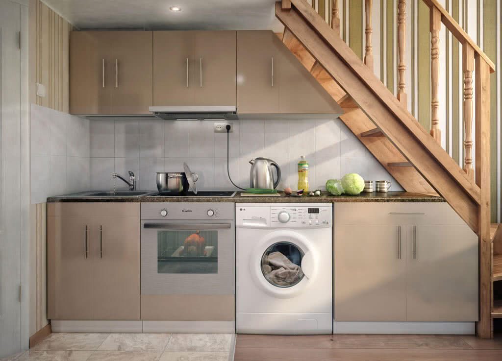 Кроме того стиральная машина под столешницу на кухне не влияет на корректную работу кухонных приборов. Однако помните, что во время работы стиралка создает вибрацию.