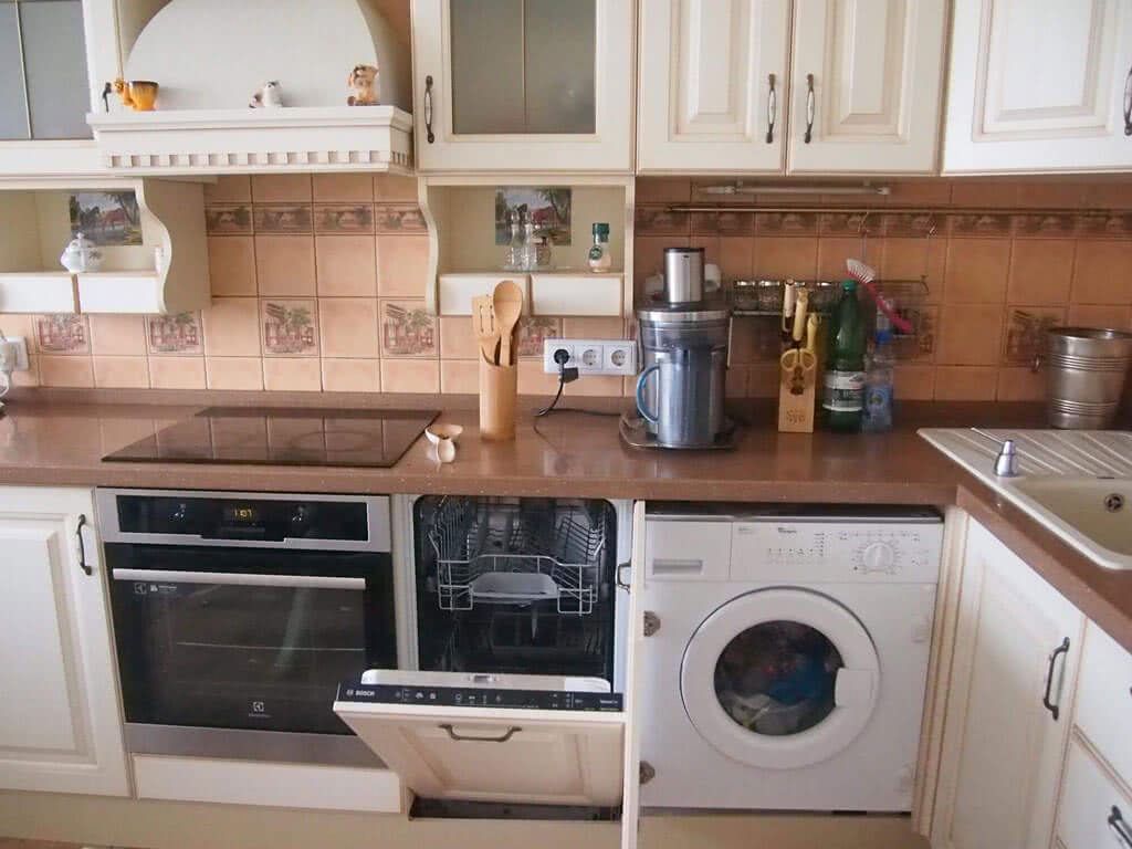 - Внешний вид машинки не всегда сочетается с фасадами и портит общую картину интерьера (например, современный дизайн техники и классический стиль гарнитура);