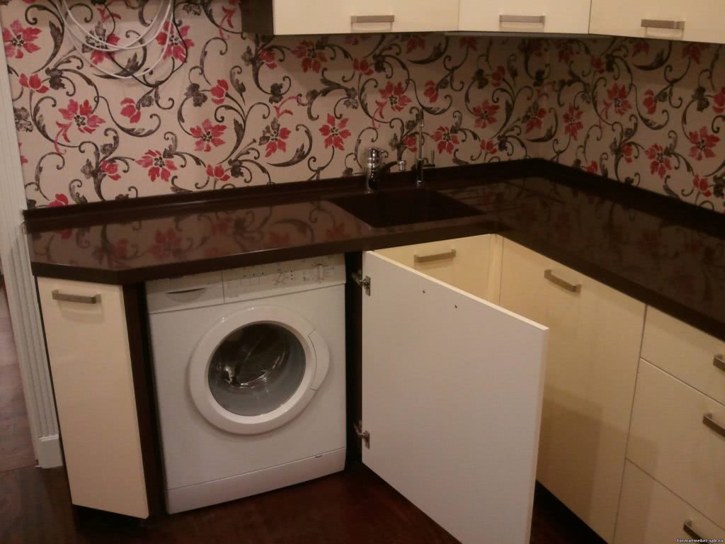 Стиральная машина под столешницей гарнитура с трапециевидной мойкой