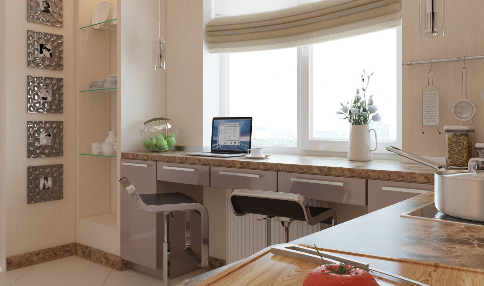 У размещения рабочей поверхности на подоконнике есть много плюсов.