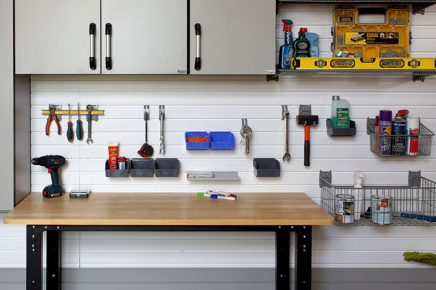 Место для инвентаря . Предназначенный для гаража верстак должен иметь необходимое количество отсеков и шкафов для расположения всех , чтобы они всегда были под рукой.