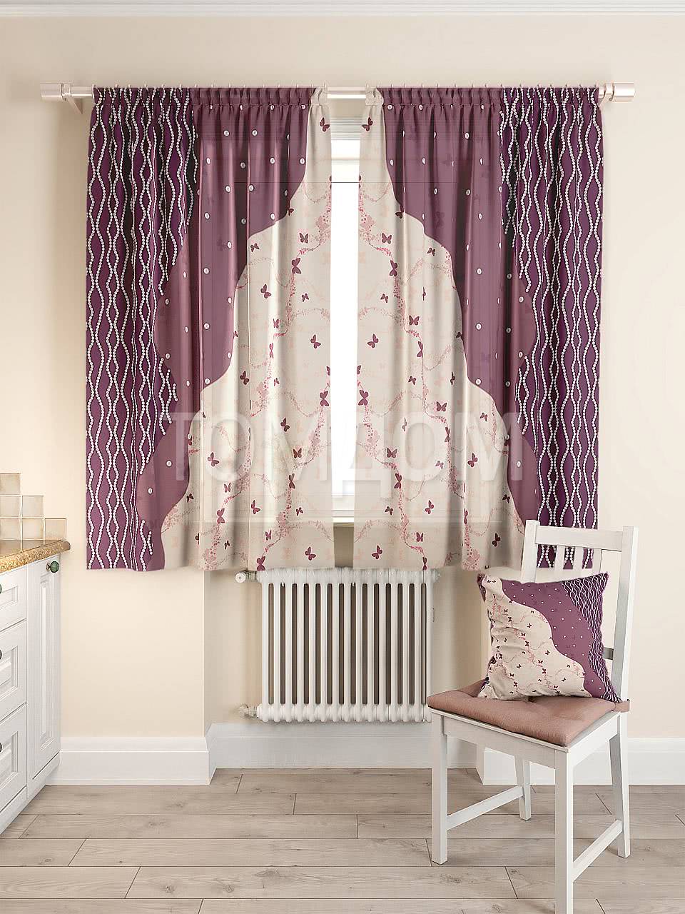 - Отлично сочетание свагов и кокилье со строгой вертикальной драпировкой в комнате с однотонными фиолетовыми обоями.