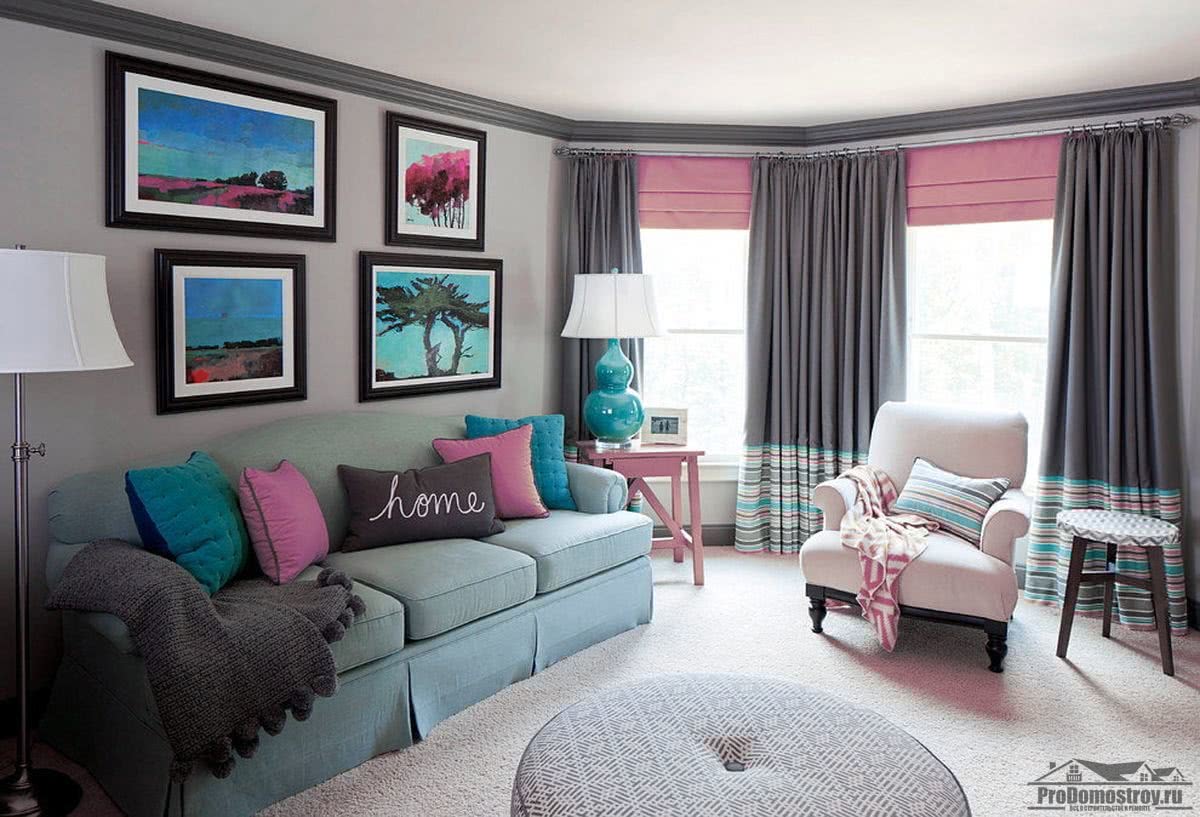 Важно правильно комбинировать не только цвета, но и фактуру, рисунок, форму. Шторы должны выделяться на фоне стен
