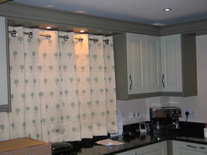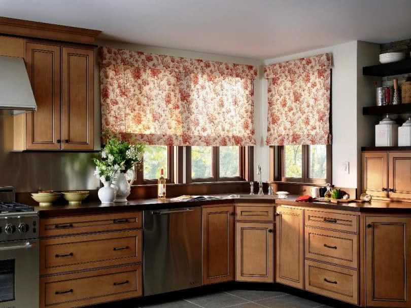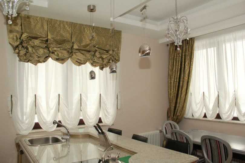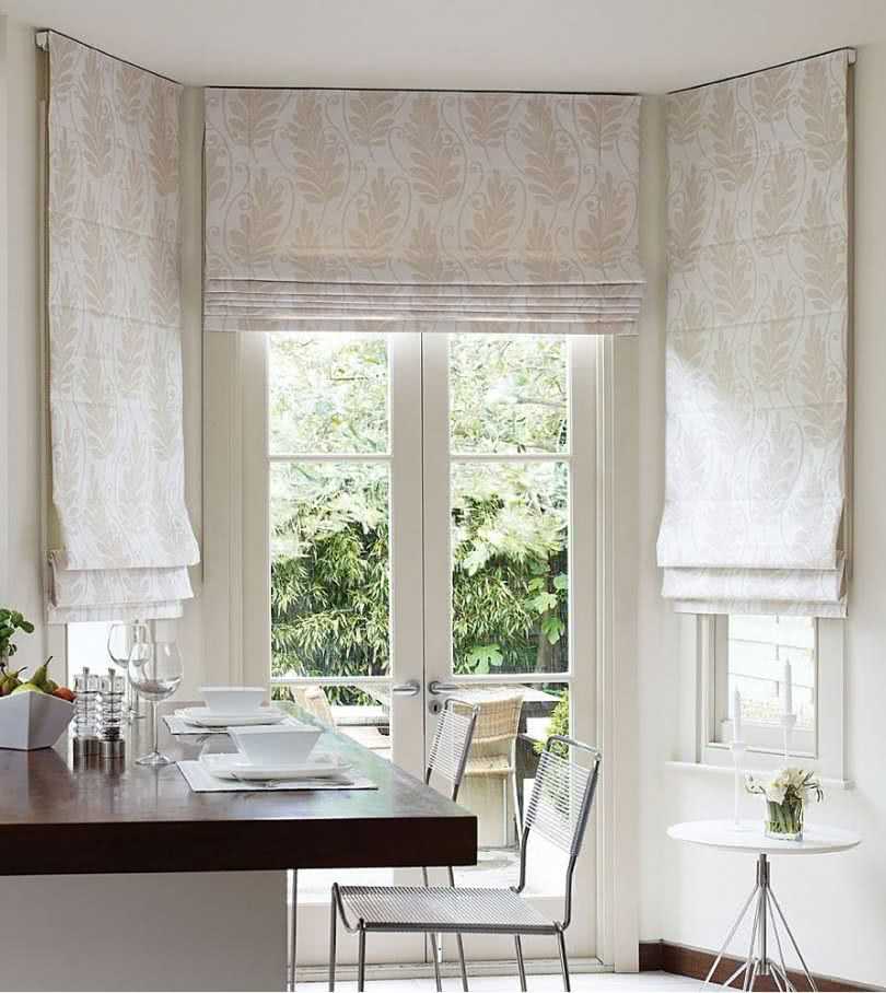 Аналогично римским могут подниматься и опускаться, но с помощью уже рулонного механизма. Такие лучше шить из плотного и жесткого материала, который хорошо держит форму и плохо впитывает жир и другие загрязнения, характерные для кухонного помещения.
