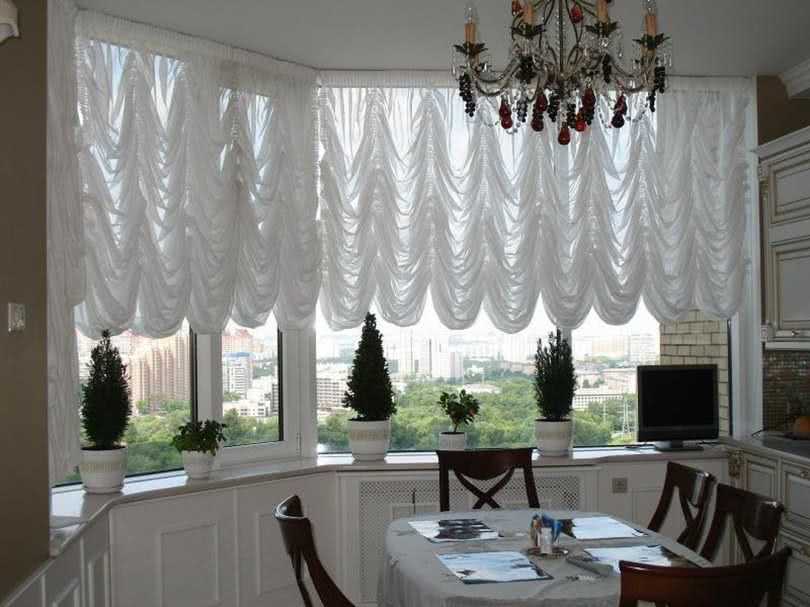 Оригинально подойдет тюль для штор маленькой кухни. Занавески в виде арки, либо использование прихватов с обеих сторон, способствуют свободному доступу к использованию подоконника, не препятствуют уборке и создают комфортную атмосферу. Такие занавеси смотрятся легко и воздушно, придают уют и благородство кухни.