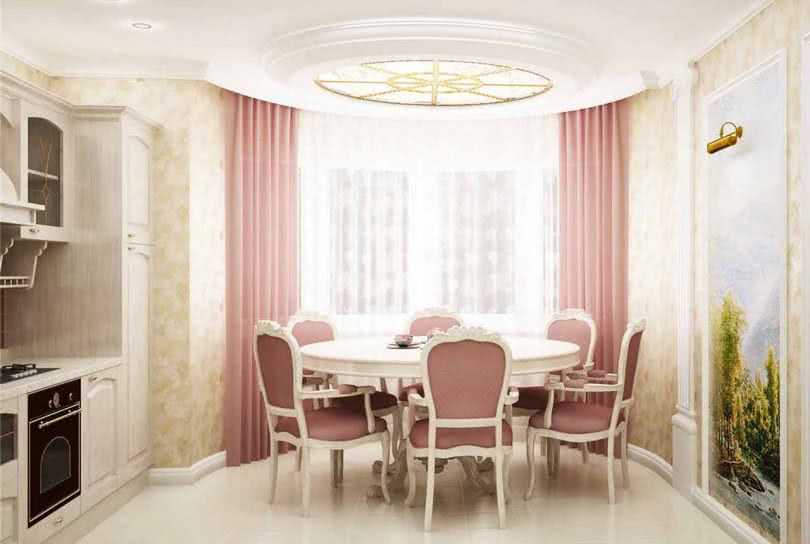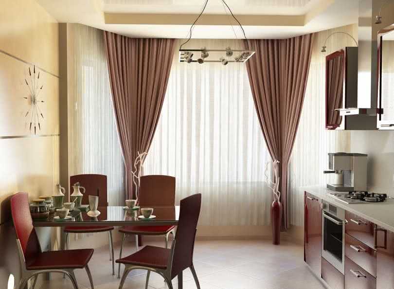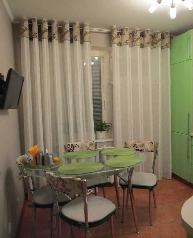 В кухне большой площади или кухне-столовой можно дополнить тюль красивыми портьерами – шторами из плотной ткани.