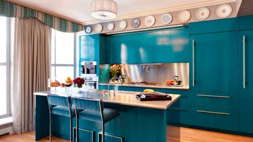 Жалюзи в данном сезоне практически не применяются, хотя в современном дизайне кухни допустимо применение коротких вертикальных жалюзи яркого цветового решения.