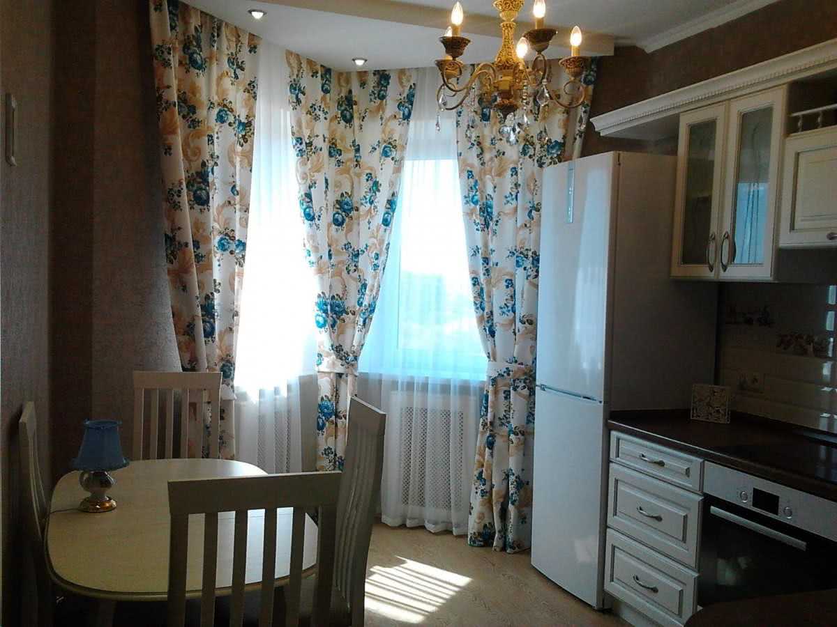 Ремарка: выбор штор на кухню с балконной дверью отличается — тут обычные длинные шторы в пол становятся рациональным выбором.