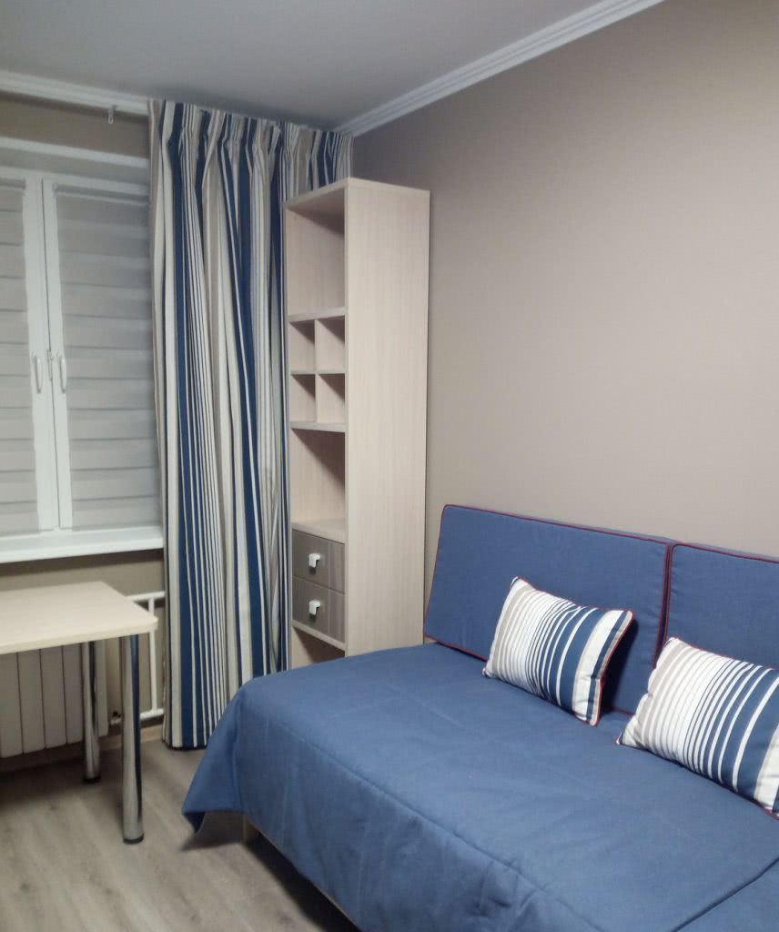 - Минимализм говорит сам за себя, ограничимся минимумом деталей. Цвета в комнате — нейтральные, шторы — самые простые и легкие.