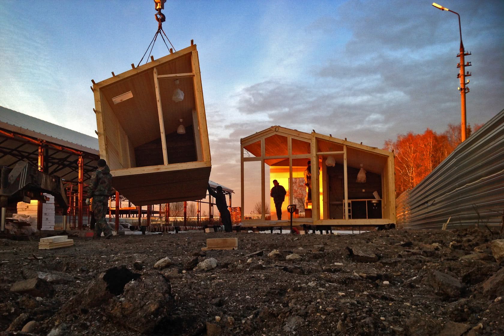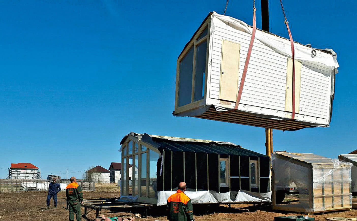 - за два-три дня рабочие соединят все секции в одну конструкцию, соединят коммуникации отдельных комнат в единую систему и подключат её к общим сетям.