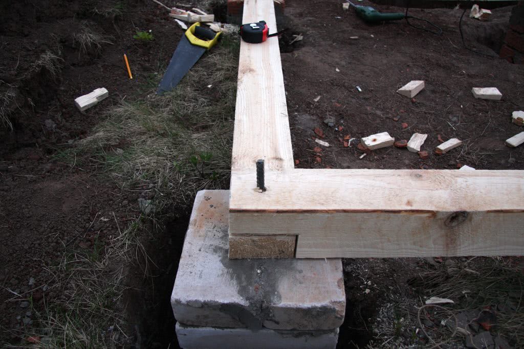 Какой выступ блоков или заливки бетоном? Чтобы после их нижней обвязки оставалось 25 – 30 см. Обвязка – это самые толстые из купленных брусов. Их кладете на столбики с куском рубероида. Длинные сочленяете с короткими различными способами – например, в «полдерева» с креплением большими шурупами.