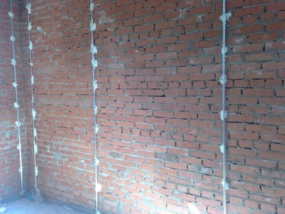 - Если стены сделаны из гладкого кирпича, для улучшения сцепления на кирпиче делаются насечки. Это можно сделать своими руками с помощью зубила и молотка. Глубина насечек делается порядка 3-5 миллиметров, длина 10-15 миллиметров. Несколько более затратной альтернативой нанесению насечек является закрепление на кирпичной стене армированной ячеистой сетки. Сетка крепится гвоздями, которые вбиваются в швы кладки.
