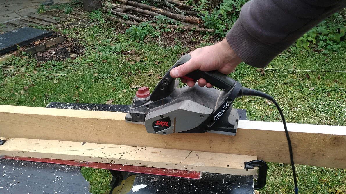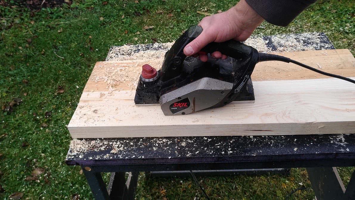 Перед склеиванием нужно обработать боковые кромки досок. Они должны быть гладкими, идеально прямыми и строго перпендикулярными пластям. Лучше всего выполнить операцию позволяет рейсмусный или фуговальный станок, но мало у кого на даче есть такое оборудование. Приходится пользоваться обычным или электрическим рубанком и визуально контролировать качество обработки. Спешить на этом этапе нельзя: при существенных зазорах (более 0,2 мм) и заваленных кромках части ступени не получится надёжно склеить.